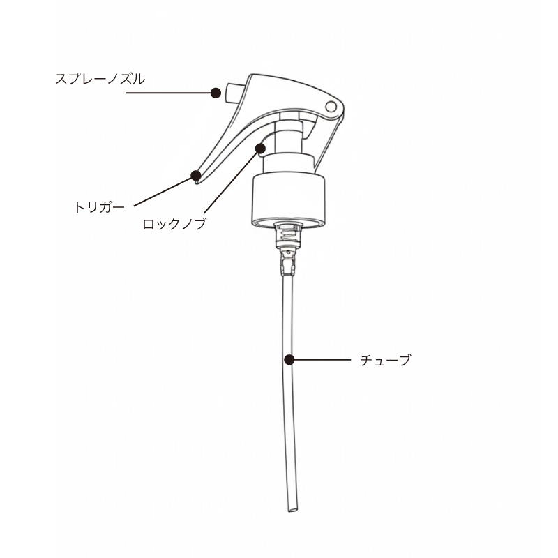 使用してください。また、液出るようになるまでトリガーを数回引く動作が必要です。ロック機構は密閉用機能ではなくトリガーの誤動作防止用で、初回時のみ使用します。スプレーヘッドは、液剤噴射角度が広いため、スプレーノズル先端がエアブラシのカップ内に入るようにしてトリガーを引いてスプレーしてください。カップ内の側面にも吹き付けられる仕様です。